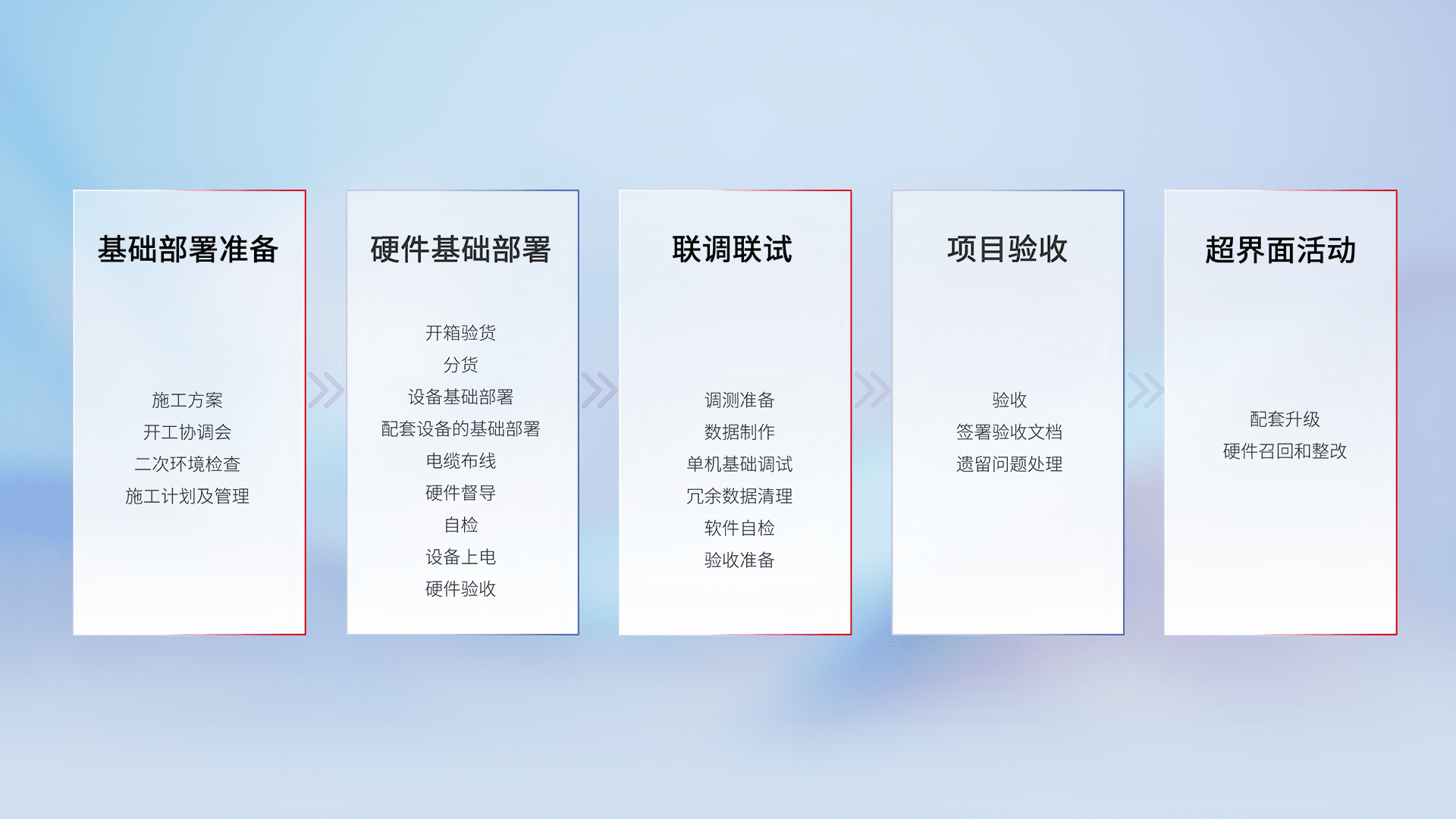 从基础部署准备、、、、硬件基础部署、、、、联调联试、、、、项目验收、、越界面活动的全过程可追溯,,保证施工质量和进度。。。