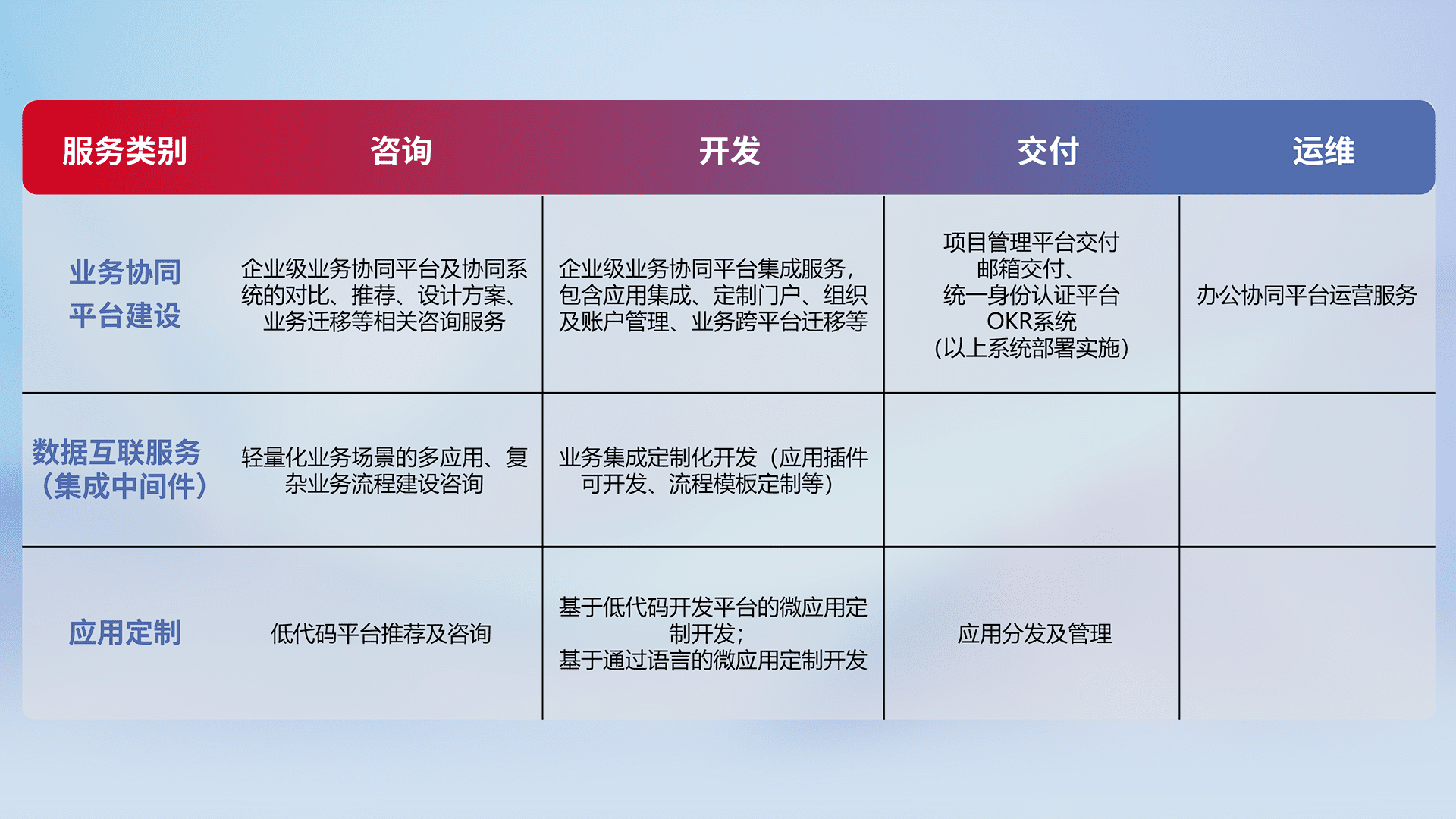 针对钉钉、、、企微、、、、IDaas等平台级产品提供产品的规划、、、、方案、、、交付、、、、定制化开发等服务,,实现如统一协同办公、、、、智能客户服务、、、混合会议管理、、、、智能数据查询、、等业务场景,,,实现数字化转型。。。
